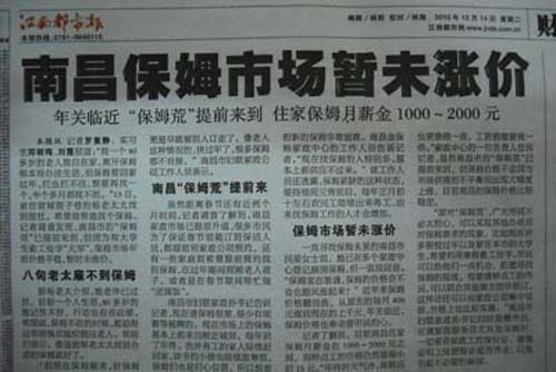 記者了解到,目前南昌住家保姆月薪金在1000~2000元之間,而鐘點工的價格仍然是每小時15元。“年終時天氣冷,保姆活也更難做一些,工資稍微要高一些。”家政中心的一位負責人告訴記者,雖然南昌市的“保姆荒”已提前來到,但保姆價格不會因為市場供需的不平衡而出現(xiàn)大幅度上漲,目前南昌的保姆價格比較穩(wěn)定。